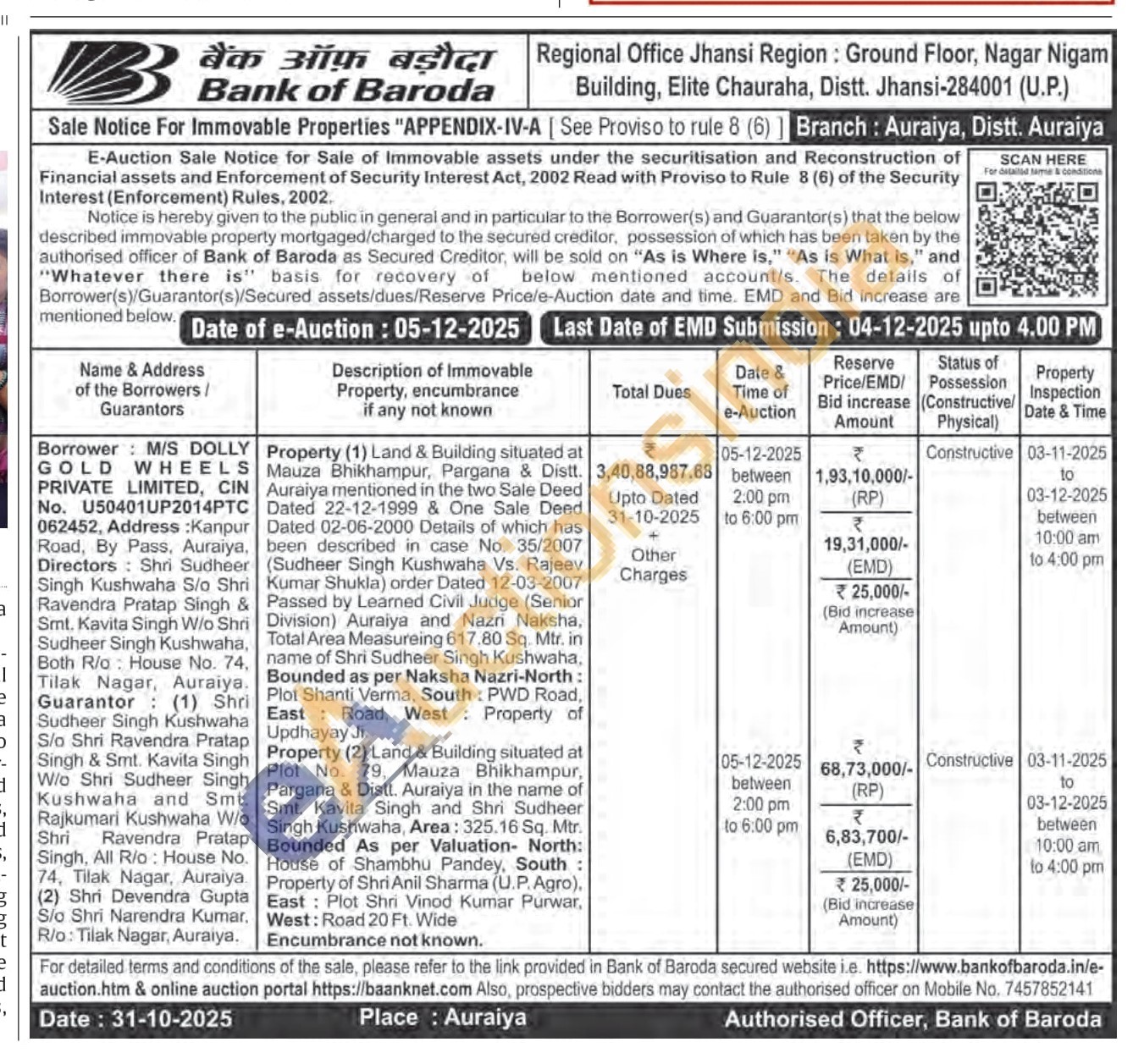 Property (1) Land & Building situated at Mauza Bhikhampur, Pargana & Distt. Auraiya mentioned in the two Sale DeedDated 22-12-1999 & One Sale Deed Dated 02-06-2000 Details of which has , been described in case No. 35/2007 (Sudheer Singh Kushwaha Vs. Rajeev Kumar Shukla) order Dated 12-03-2007 Passed by Learned Civil Judge (Senior Division) Auraiya and Nazri Naksha, Total Area Measureing 617.80 Sq. Mtr. in name of Shri Sudheer Singh Kushwaha, Bounded as per Naksha Nazri-North: Plot Shanti Verma, South: PWD Road, East Road, West Property of Updhayay Ji. Property (2) Land & Building situated at Plot No. 79, Mauza Bhikhampur, Pargana & Distt. Auraiya in the name of Smt. Kavita Singh and Shri Sudheer Singh Kushwaha, Area: 325.16 Sq. Mtr. Bounded As per Valuation- North: House of Shambhu Pandey, South: Property of Shri Anil Sharma (U.P. Agro), East: Plot Shri Vinod Kumar Purwar, West: Road 20 Ft. Wide