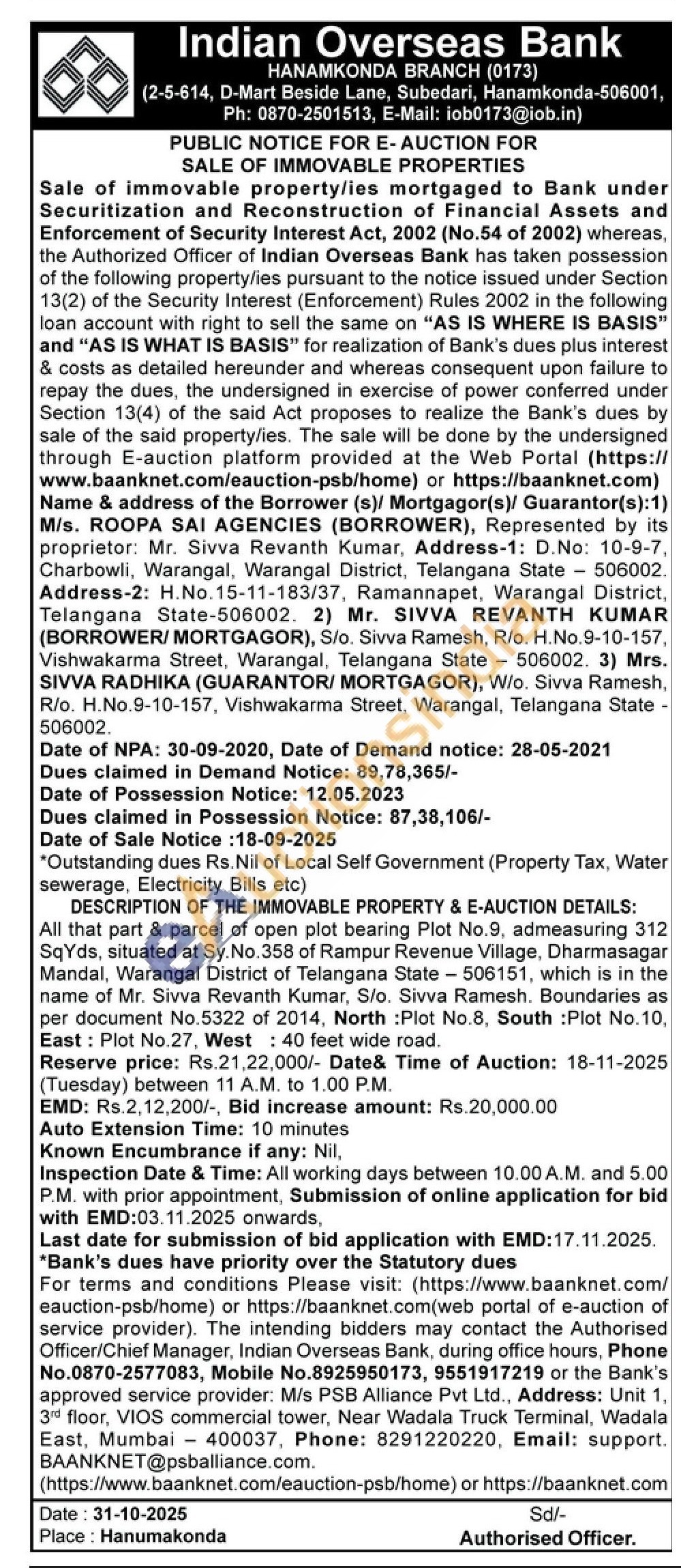 All that part & parcel of open plot bearing Plot No.9, admeasuring 312 SqYds, situated at Sy. No. 358 of Rampur Revenue Village, Dharmasagar Mandal, Warangal District of Telangana State 506151, which is in the name of Mr. Sivva Revanth Kumar, S/o. Sivva Ramesh. Boundaries as per document No.5322 of 2014, North: Plot No.8, South : Plot No.10, East: Plot No.27, West 40 feet wide road.