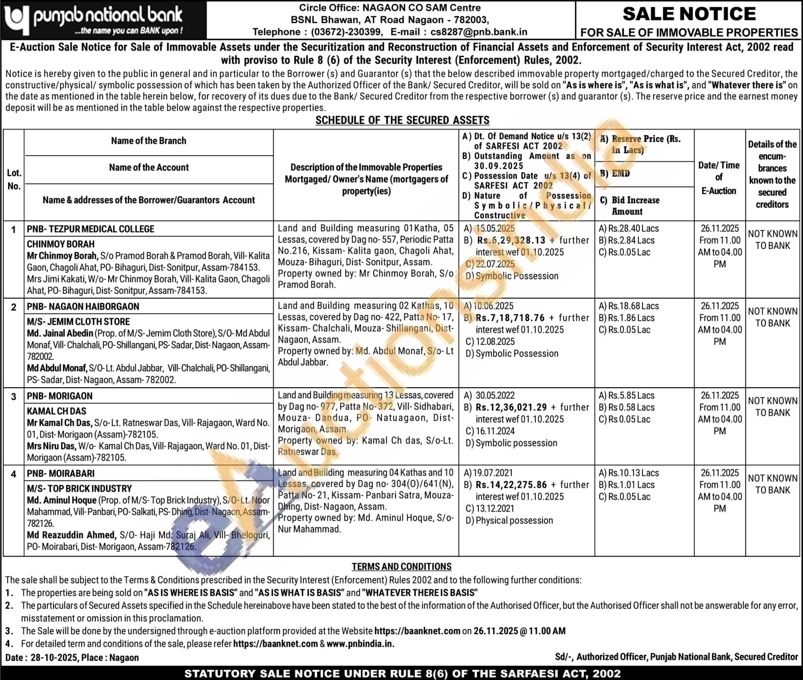 1)Land and Building measuring 01Katha, 05 Lessas, covered by Dag no- 557, Periodic Patta No.216, Kissam-Kalita gaon, Chagoli Ahat, Mouza-Bihaguri, Dist- Sonitpur, Assam. Property owned by: Mr Chinmoy Borah, S/o Pramod Borah.