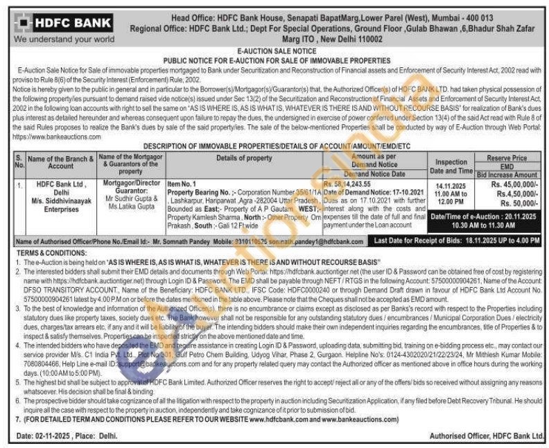Property Bearing No. Corporation Number 35/61/1A Lashkarpur, Haripanwat Agra-282004 Uttar Pradesh Bounded as East:- Property of A P Gautam Property Kamlesh Sharma, North:-Other Property Prakash, South Galil 12 Ft wide