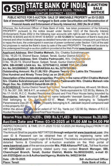 A-SCHEDULE: Guntur District Tenali Sub District, Tenali Muncipal Area, 4th ward, 5th Block, T.S. No.357, 358, 360 & 411, an extent of 147 Sq. Yards equivalent to 122.90 Sq. Meters, Dr. No. 17-10-55, R.C.C. Roofed Residential Ground and First Floor House being bounded by Boundaries: East: Muncipal Bazaar by name tadiparthi Veeraiah Sandu-25-0", South: Wall belonging to Ch. Satyavathi-53-0", West: Property belonging to Tadiparthi Parameswara Das-25-0", North: Property belonging to K. Jakraiah beyond compound wall in this property-53-0".