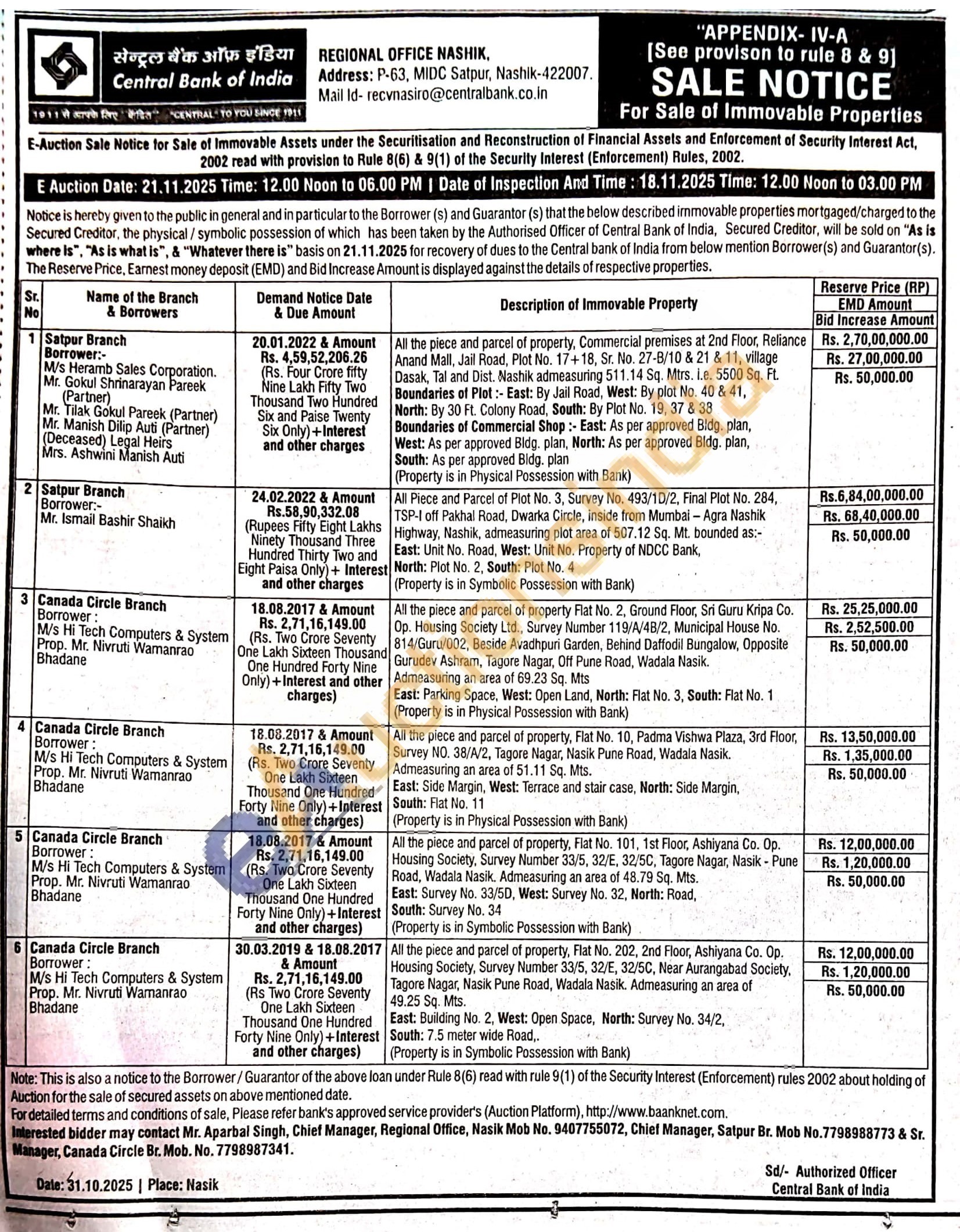 Contact Mr. Aparbal Singh, Chief Manager, Regional Office, Nasik Mob No. 9407755072, Chief Manager, Satpur Br. Mob No.7798988773 & Sr. Manager, Canada Circle Br. Mob. No. 7798987341