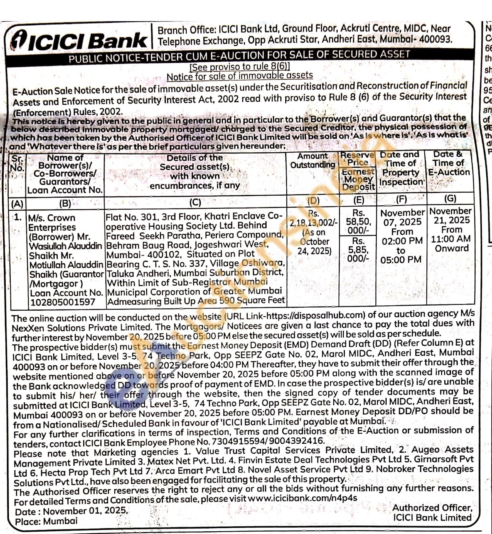 Flat No. 301, 3rd Floor, Khatri Enclave Co-operative Housing Society Ltd. Behind Fareed Seekh Paratha, Periera Compound, Behram Baug Road, Jogeshwari West, Mumbai-400102, Situated on Plot Bearing C. T. S. No. 337, Village Oshiwara, Taluka Andheri, Mumbai Suburban District, Within Limit of Sub-Registrar Mumbai Municipal Corporation of Greater Mumbai Admeasuring Built Up Area 590 Square Feet