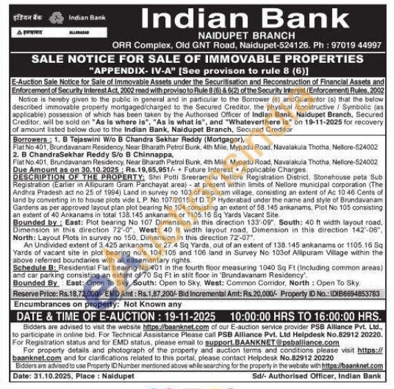 DESCRIPTION OF THE PROPERTY: Shri Potti Sreeramulu Nellore Registration District. Stonehouse peta Sub Registration (Earlier in Allipuram Gram Panchayat area) at present within limits of Nellore municipal corporation (The Andhra Pradesh act no 25 of 1994) Land in survey no no 103 of allipuram village, consisting an extent of Ac 10 46 Cents of land by converting in to house plots vide L. P. No. 107/2015 of D.T.P Hyderabad under the name and style of Brundavanam Gardens as per approved layout plan plot bearing No 104 consisting an extent of 58. 145 ankanams, Plot No 105 consisting an extent of 40 Ankanams in total 138.145 ankanams or 1105.16 Sq Yards Vacant Site Bounded by: East: Plot bearing No 107 Dimension in this direction 133-09", South: 40 ft width layout road, Dimension in this direction 72-0", West: 40 ft width layout road, Dimension in this direction 142-06" North: Layout Plots in survey no 150, Dimension in this direction 72-07". An Undivided extent of 3.425 ankanams or 27.4 Sq Yards, out of an extent of 138.145 ankanams or 1105.16 Sq Yards of vacant site in plot bearing no's 104,105 and 106 land in Survey No 103of Allipuram Village within the above referred boundaries with all easementary rights. Schedule B: Residential Flat bearing No 401 in the fourth floor measuring 1040 Sq Ft (Including common areas). and car parking consisting an extent of 70 Sq Ft in stilt floor in 'Brundavanam Residency Bounded By East: Open To Sky, South: Open to Sky. West: Common Corridor, North: Open To Sky