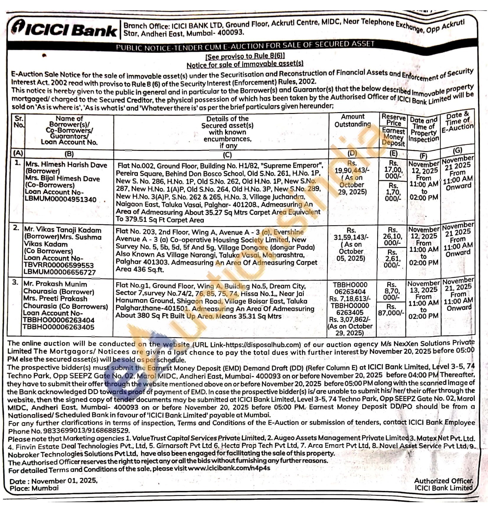1)Flat No.002, Ground Floor, Building No. H1/82, "Supreme Emperor", Pereira Square, Behind Don Bosco School, Old S.No. 261, H.No. 1P, New S. No. 286, H.No. 1P, Old S.No. 262, Old H.No. 1P, New S.No. 287, New H.No. 1(A)P, Old S.No. 264, Old H.No. 3P, New S.No. 289, New H.No. 3(A)P, S.No. 262 & 265, H.No. 3. Village Juchandra, Naigaon East, Taluka Vasai, Palghar- 401208., Admeasuring An Area of Admeasuring About 35.27 Sq Mtrs Carpet Area Equivalent To 379.51 Sq Ft Carpet Area