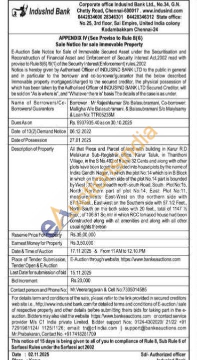 All that Piece and Parcel of land with building in Karur RLD Melakarur Sub-Registrar office, Karur Taluk, in Thanthoni Village, in the 5 No 492 of 8 acre 32. Cents and along with other plots have been together divided into house plots by the name of Indira Gandhi Nagar, in which the plot No: 14 which is in B Block in which on the southem side of the plot No.14 part is bounded by West: 30 Feet breadth north-south Road, South: Plot No: 15, North: Northern part of plot No:14, East: Plot No:11. measurements. East-West on the northern side with 57.1/4Feet, East-west on the Southem side with 57.1/2 Feet, North-South on the both sides with 20 feet, total of 1147% Feet, of 106.61 Sq.mtr in which RCC terraced house had been constructed along with all amenities and along with all other usual rights thereon