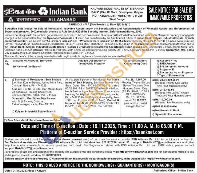 All that part & parcel of Residential Flat in the name of Sujit Biswas, S/o. Sisir Biswas vide Sale Deed No.1-1303-00577/2018 dated 05.02.20218 & at B-6/272, Flat No. B, 4th floor, North East facing at Matri Bhumi Co-operative Housing Society Ltd., B-6/272, Kalyani, Nadia, Pin-741235 Under Kalyani Municipality, Area 1000 Sq. Ft. (Super Built Area) Butted & bounded by North Plot B-6/273, South: Plot B-6/271, East: Road, West: Plot B-6/269.