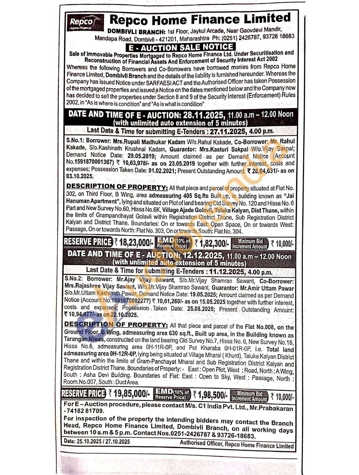 DESCRIPTION OF PROPERTY: All that piece and parcel of the Flat No.008, on the Ground Floor, B Wing, admeasuring area 630 sq.ft., Built up area, in the Building known as Tarangan Niwas, constructed on the land bearing Old Survey No.7, Hissa No. 6, New Survey No.18, Hissa No.6, admeasuring area OH-11R-OP, and Pot Kharaba 0H-01R-OP, i.e. Total land admeasuring area OH-12R-OP, lying being situated at Village Mharal (Khurd), Taluka Kalyan District Thane and within the limits of Gram-Panchayat Mharal and Sub Registration District Kalyan and Registration District Thane. Boundaries of Property: East: Open Plot, West: Road, North: A Wing, South: Asha Devi Building. Boundaries of Flat: East: Open to Sky, West: Passage, North: Room.No.007, South: Duct Area