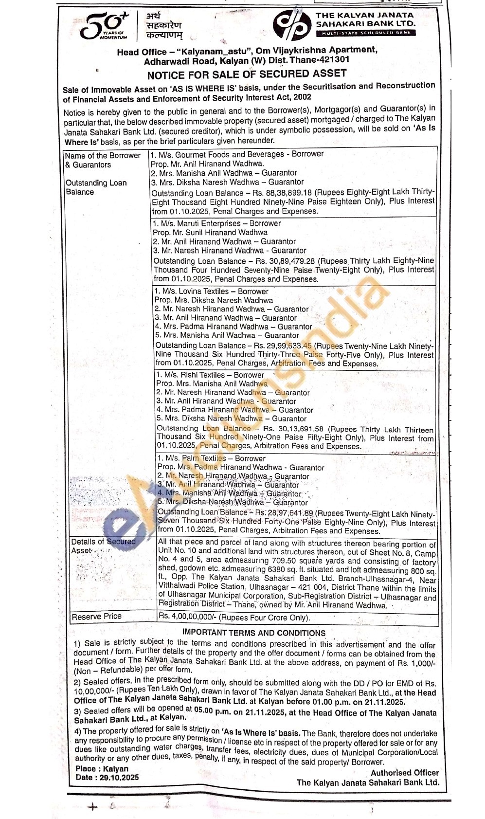 All that piece and parcel of land along with structures thereon bearing portion of Unit No. 10 and additional land with structures thereon, out of Sheet No. 8, Camp No. 4 and 5, area admeasuring 709.50 square yards and consisting of factory shed, godown etc. admeasuring 6380 sq. ft. situated and loft admeasuring 800 sq. ft., Opp. The Kalyan Janata Sahakari Bank Ltd. Branch-Ulhasnagar-4, Near Vitthalwadi Police Station, Ulhasnagar-421 004, District Thane within the limits of Ulhasnagar Municipal Corporation, Sub-Registration District-Ulhasnagar and Registration District-Thane, owned by Mr. Anil Hiranand Wadhwa.