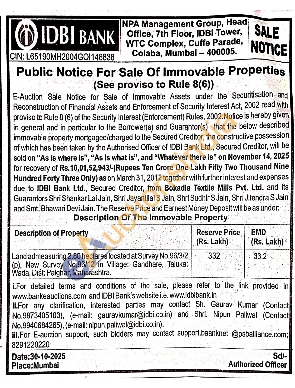 Land admeasuring 2.80 hectares located at Survey No.96/3/2 (p), New Survey No.96/12 in Village: Gandhare, Taluka: Wada, Dist: Palghar, Maharashtra.