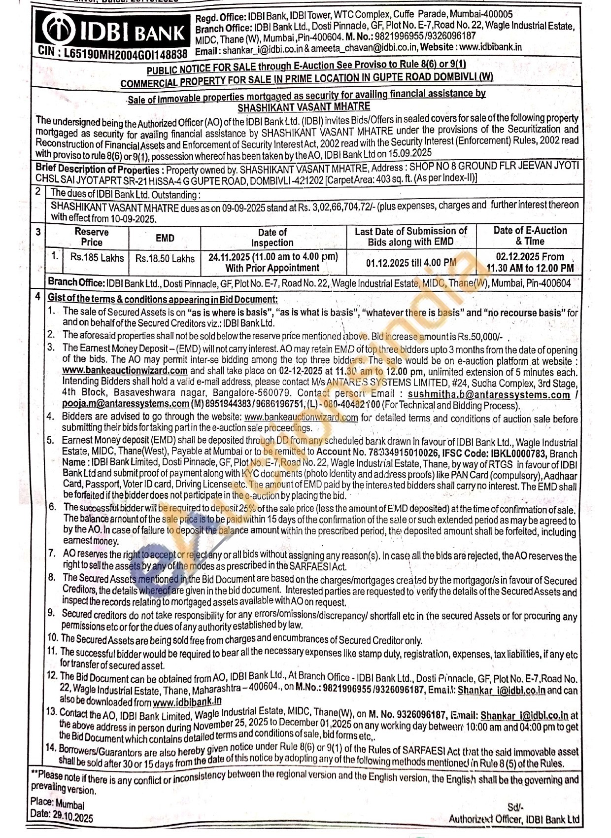 Brief Description of Properties: Property owned by. SHASHIKANT VASANT MHATRE, Address: SHOP NO & GROUND FLR JEEVAN JYOTI CHSL SAI JYOTAPRT SR-21 HISSA-4 G GUPTE ROAD, DOMBIVLI-421202 [Carpet Area: 403 sq. ft. (As per Index-II)]