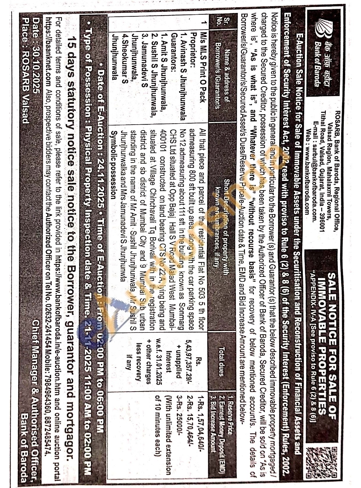 All that piece and parcel of the residential Flat No 503 5 th floor admeasuring 800 sft built up area along with the car parking space No 12 admeasuring about 111 sft in the building known as Sonmarg CHS Ltd situated at Opp Bajaj Hall SV Road Malad West Mumbai-400101 constructed on land bearing CTS No 22 A, lying being and situated at Village Chinchavali Tq Borivali with in the registration district and sb district of Mumbai City and 9 Mumbai Sub urban standing in the name of Mr Amit Sushil Jhunjhunwala, Mr Sushil S Jhunjhunwalka and Mrs Jamunadevi S Jhunjhunwla