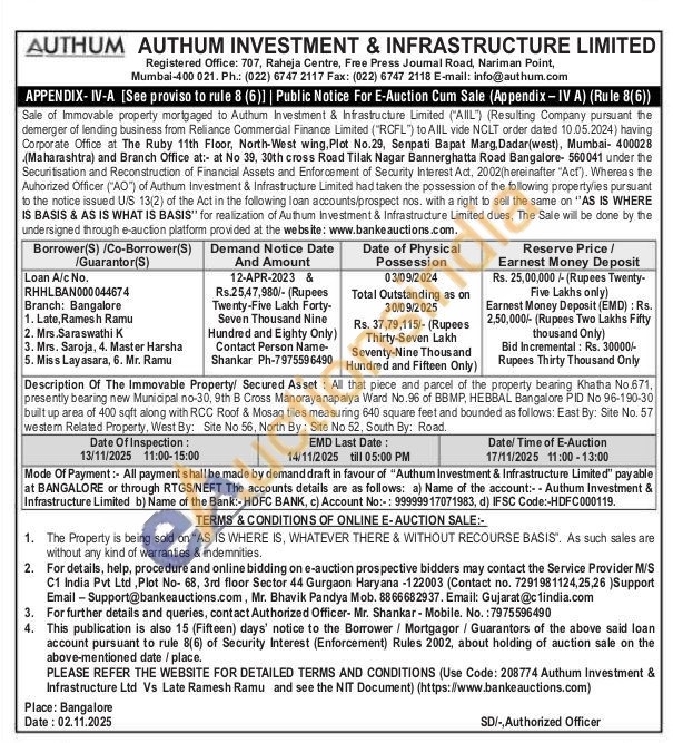 Description Of The Immovable Property/ Secured Asset: All that piece and parcel of the presently bearing new Municipal no-30, 9th B Cross Manorayanapalya Ward No.96 of BBMP, HEBBAL Bangalore PID No 96-190-30 built up area of 400 sqft along with RCC Roof & Mosaq tiles measuring 640 square feet and bounded as follows: East By: Site No. 57 western Related Property, West By: Site No 56, North By: Site No 52, South By: Road