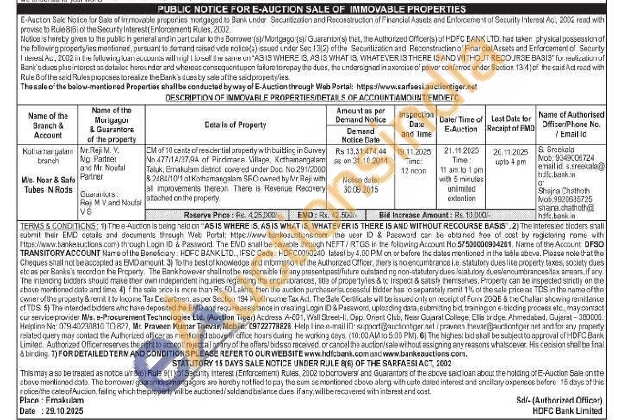 EM of 10 cents of residential property with building in Survey No 477/14/37/9A of Pindimana Village, Kothamangalam Taluk, Emakulam district covered under Doc. No. 291/2000 &2484/10/1 of Kothamangalam SRO owned by Mr Reji with all improvements thereon. There is Revenue Recovery attached on the property.