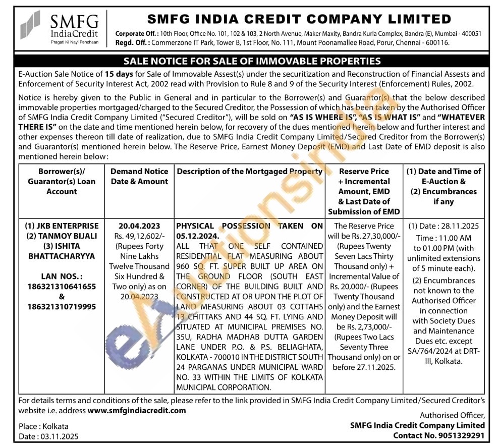 ALL THAT ONE SELF CONTAINED RESIDENTIAL FLAT MEASURING ABOUT 960 SQ. FT. SUPER BUILT UP AREA ON THE GROUND FLOOR (SOUTH EAST CORNER) OF THE BUILDING BUILT AND CONSTRUCTED AT OR UPON THE PLOT OF LAND MEASURING ABOUT 03 COTTAHS 13 CHITTAKS AND 44 SQ. FT. LYING AND SITUATED AT MUNICIPAL PREMISES NO. 35U, RADHA MADHAB DUTTA GARDEN LANE UNDER P.O. & P.S. BELIAGHATA, KOLKATA-700010 IN THE DISTRICT SOUTH 24 PARGANAS UNDER MUNICIPAL WARD NO. 33 WITHIN THE LIMITS OF KOLKATA MUNICIPAL CORPORATION.