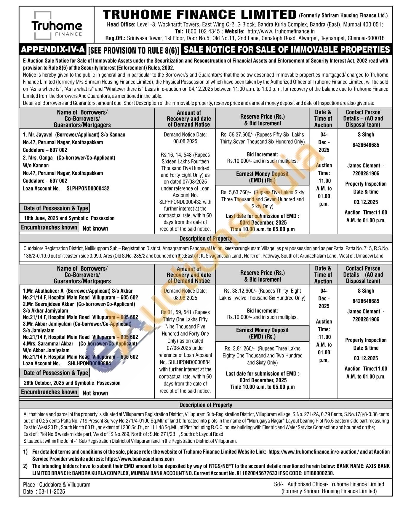 All that piece and parcel of the property is situated at Villupuram Registration District, Villupuram Sub-Registration District, Villupuram Village, S.No. 271/2A, 0.79 Cents, S.No. 178/8-0.36 cents out of it 0.25 cents Patta No. 719 Present Survey No.271/4-0100 Sq.Mtr of land bifurcated into plots in the name of "Murugaiya Nagar" Layout bearing Plot No.6 eastern side part measuring East to West 20 Ft., South North 60 Ft., an extent of 1200 Sq.Ft., or 111.48 Sq.Mt., of Plot including R.C.C. house building with Electric and Water Service Connection and bounded on the East of: Plot No.6 western side part, West of: S.No. 289, North of: S. No.271/28 South of: Layout Road Situated at within the Joint-1 Sub Registration District of Villupuram and in the Registration District of Villupuram.