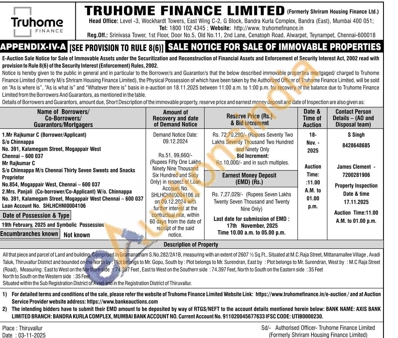 All that piece and parcel of Land and building, Comprised in Gramanatham S.No.282/2A1B, measuring with an extent of 2607½ Sq.Ft., Situated at M.C.Raja Street, Mittanamallee Village, Avadi Taluk, Thiruvallur District and bounded on the North by: Plot belongs to Mr. Gopu, South by: Plot belongs to Mr. Surendran, East by: Plot belongs to Mr. Surendran, West by: M.C Raja Street (Road), Measuring: East to West on the Northern side: 74.397 Feet, East to West on the Southern side: 74.397 Feet, North to South on the Eastern side: 35 Feet North to South on the Western side: 35 Feet Situated within the Sub Registration District of Avadi and in the Registration District of Thiruvallur.