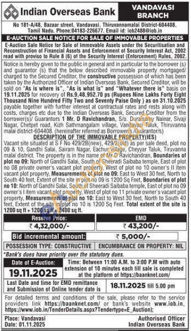 Vacant site situated at S F No 429/28(new), 429/2(old) as per sale deed, plot no 09 & 10, Gandhi Salai, Sairam Nagar, Eachur village. Cheyyar Taluk, Tiruvanna malai district. The property is in the name of Mr D Ravichandran, Boundaries of plot no 09: North of Gandhi Salai, South of Sheeradi Saibaba temple, East of plot no 0B private owner's vacant plot property, West of plot no 10 owner's II item vacant plot property, Measurements of plot no 09: East to West 30 feet, North to South 40 feet, Extent of the site in plot no 09 is 1200 Sq Feet, Boundaries of plot no 10: North of Gandhi Salai, South of Sheeradi Saibaba temple, East of plot no 09 owner's I item vacant plot property, West of plot no 11 private owner's vacant plot property, Measurements of plot no 10: East to West 30 feet, North to South 40 feet, Extent of the site in plot no 10 is 1200 Sq Fest. Total extent of the site is 1200 sq ft+1200 sq ft = 2400 sq