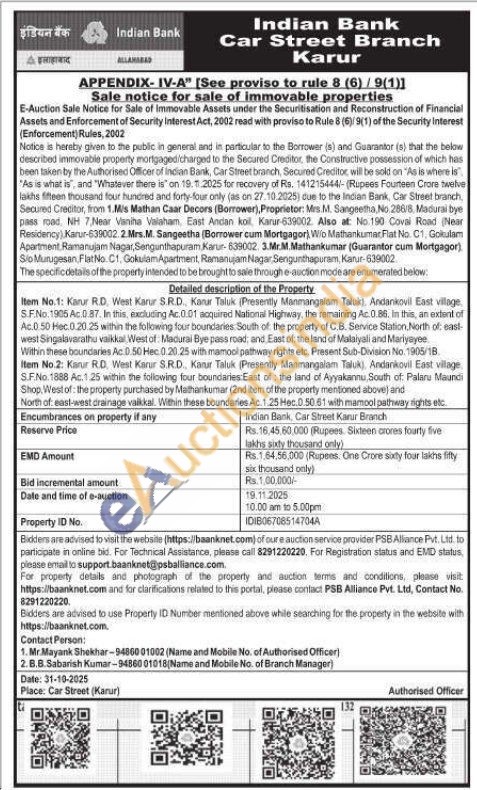 Item No.1: Karur RD, West Karur SR.D., Kanur Taluk (Presently Manmangalam Taluk), Andankovil East village, 5.F.No. 1905 Ac..87. In this, excluding Ac 0.01 acquired National Highway, the remaining Ac. 0.86. In this, an extent of Ac.0.50 Hec.0.20.25 within the following four boundaries South of the property of C.B. Service Station, North of east-west Singalaverathu vaikkal West of. Madurai Bye pass road, and East of the land of Malaiyali and Mariyeyee Within these boundaries Ac 0.50 Hec. 0.20.25 with mamool pathway rights etc. Present Sub-Division No. 1905/18. Item No.2: Karur R.D. West Karur S.R.D., Kanur Taluk (Presently Manmangalam Taluk Andankovil East village, S.F.No. 1888 Ac.1.25 within the following four boundaries East of the land of Ayyakannu South of: Palaru Maundi Shop, West of the property purchased by Mathankumar (2nd item of the property mentioned above) and