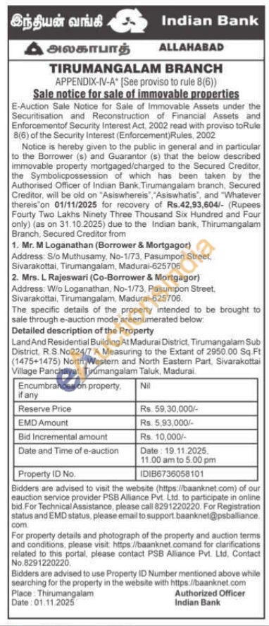 Land And Residential Building At Madurai District, Tirumangalam Sub District, R.S.No224/7 A Measuring to the Extant of 2950.00 Sq. Ft (1475+1475) North Western and North Eastern Part, Sivarakottai Village Panchayat, Tirumangalam Taluk, Madurai