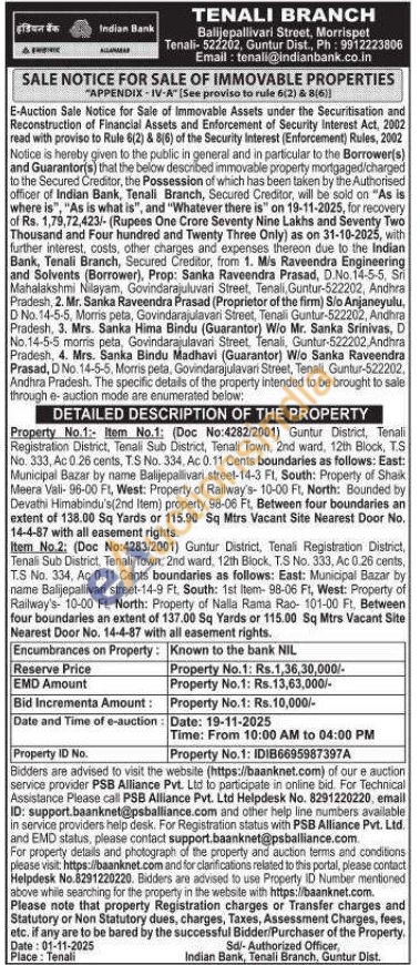 Item No.1: (Doc No:4282/2001) Guntur District, Tenali Registration District, Tenali Sub District, Tenali Town, 2nd ward, 12th Block, T.S No. 333, Ac 0.26 cents, T.S No. 334, Ac 0.11 Cents boundaries as follows: East: Municipal Bazar by name Balijepallivari street-14-3 Ft. South: Property of Shaik Meera Vali-96-00 Ft, West: Property of Railway's-10-00 Ft, North: Bounded by Devathi Himabindu's(2nd Item) property 98-06 Ft, Between four boundaries an extent of 138.00 Sq Yards or 115.90 Sq Mtrs Vacant Site Nearest Door No. 14-4-87 with all easement rights.