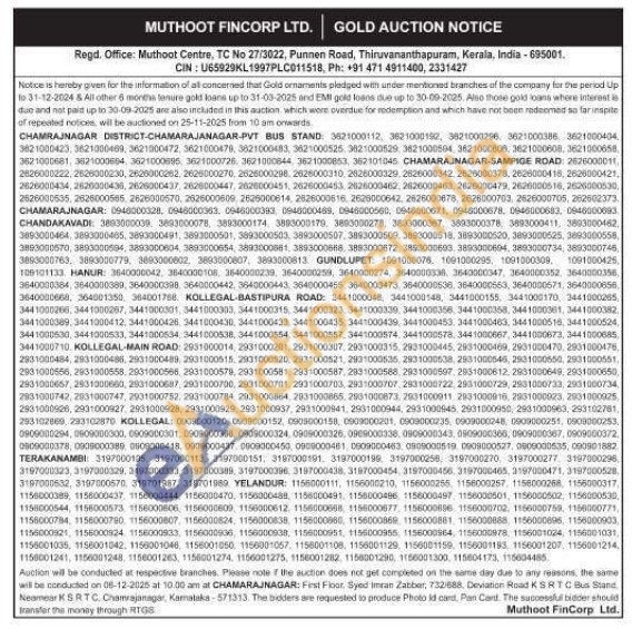 Muthoot Finance Ltd Gold Auctions Auction in Chamarajanagar