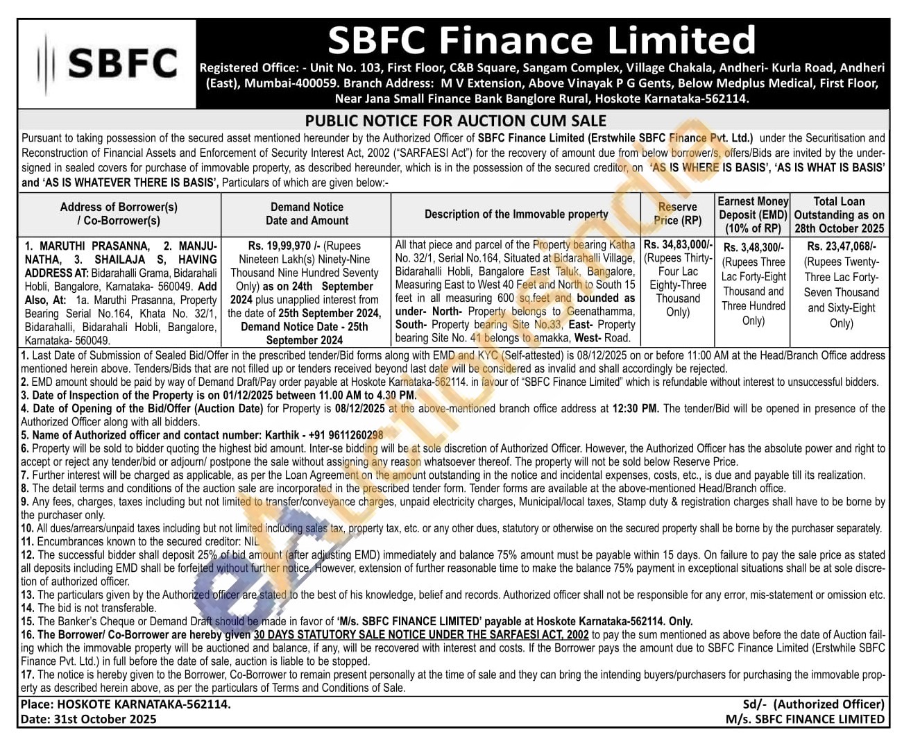 All that Piece and parcel of the Property bearing Katha No. 32/1, Serial No. 164, Situated at Bidarahalli Village, Bidarahalli Hobli, Bangalore East Taluk, Bangalore, Measuring East to West 40 Feet and North to South 15 feet in all measuring 600 sq.feet and bounded as under- North Property belongs to Geenathamma, South Property bearing Site No.33, East- Property bearing Site No. 41 belongs to amakka, West- Road.
