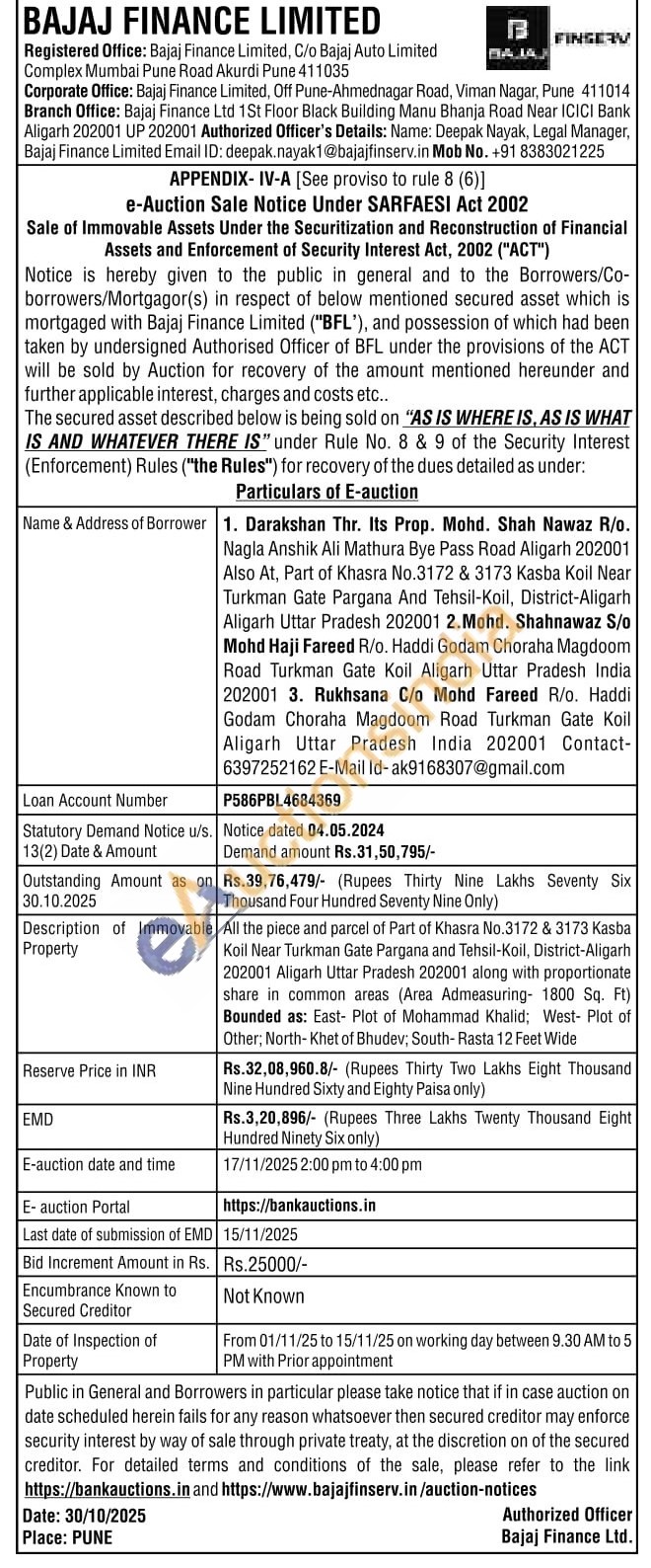 All the piece and parcel of Part of Khasra No.3172 & 3173 Kasba Koil Near Turkman Gate Pargana and Tehsil-Koil, District-Aligarh 202001 Aligarh Uttar Pradesh 202001 along with proportionate share in common areas (Area Admeasuring- 1800 Sq. Ft) Bounded as: East- Plot of Mohammad Khalid; West- Plot of Other, North-Khet of Bhudev; South-Rasta 12 Feet Wide