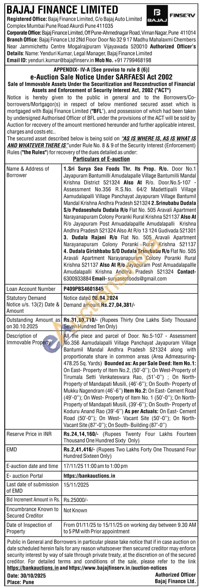 Authorized Officer's Details: Yenduri Kumar, Legal Manager Mobile No : 91 7799468198