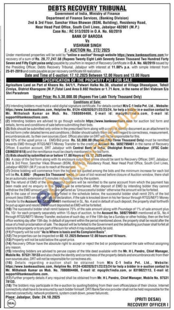 Agriculture Land on Part of Khasra No. 64/1/1, Patwari Halka No.38, situated at Village Dhasalgaon, Tehsil Zirniya, District Kharogone (M.P.) Total Land Area 0.692 Hectare or 1.71 Acre, in the name of Shri Vishram S/o Shri Parashram