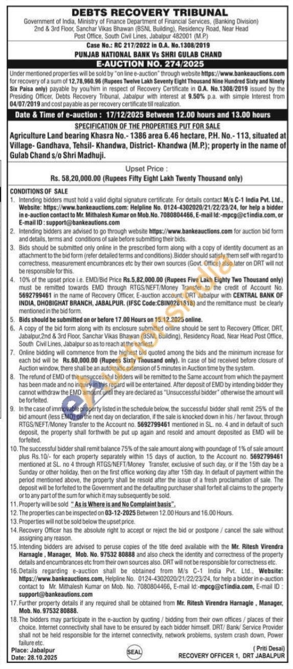 Agriculture Land bearing Khasra No.-1386 area 6.46 hectare, P.H. No.-113, situated at Village-Gandhava, Tehsil- Khandwa, District- Khandwa (M.P.); property in the name of Gulab Chand s/o Shri Madhuji