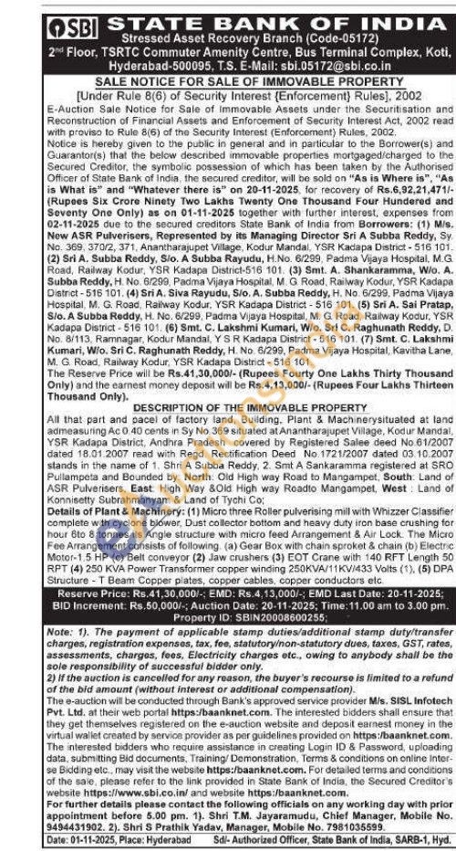 All that part and pacel of factory land, Building. Plant & Machinerysituated at land admeasuring Ac 0.40 cents in Sy No. 369 situated at Anantharajupet Village, Kodur Mandal, YSR Kadapa District, Andhra Pradesh covered by Registered Salee deed No 61/2007 dated 18.01.2007 read with Regd. Rectification Deed No 1721/2007 dated 03.10.2007 stands in the name of 1. Shri A Subba Reddy, 2. Smt A Sankaramma registered at SRO Pullampeta and Bounded by North: Old High way Road to Mangampet, South: Land of ASR Pulverisers. East High Way &Old High way Readto Mangampet, West Land of Konnisetty Subrahmanyam & Land of Tychi Co: Details of Plant & Machinery: (1) Micro three Roller pulverising mill with Whizzer Classifier complete with cycione blower, Dust collector bottom and heavy duty iron base crushing for hour 6to 8 tonnes its Angle structure with micro feed Arrangement & Air Lock. The Micro Fee Arrangement consists of following. (a) Gear Box with chain sproket & chain (b) Electric Motor-1.5 HP (c) Belt conveyor (2) Jaw crushers (3) EOT Crane with 140 RFT Length 50 RPT (4) 250 KVA Power Transformer copper winding 250KVA/11KV/433 Volts (1), (5) DPA Structure T Beam Copper plates, copper cables, copper conductors elc