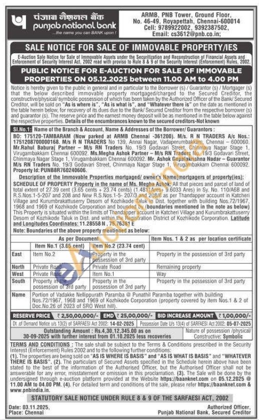 SCHEDULE OF PROPERTY Property in the name of Ms. Megha Ashok: All that pieces and parcel of land of Total extent of 27.39 cent (3.65 cents 23.74 cents) (1.4811Ares+ 9.6033 Ares) in Sy. No. 110/A6B and R.S.Nos.1-5-207 and 208 and New R.S.Nos. 1-5-207/3 and 208/6 as per Thandapper account in Katcheri Village and Kurumbrakattuserry Desom of Kozhikode Taluk in Dist, together with building Nos. 72/1967. 1968 and 1969 of Kozhikode Corporation and bounded by (boundaries mentioned in the note as below) This Property is situated within the limits of Thandapper account in Katcheri Village and Kurumbrakattuserry Desom of Kozhikode Taluk in Dist, and within the Registration District of Kozhikode Corporation.