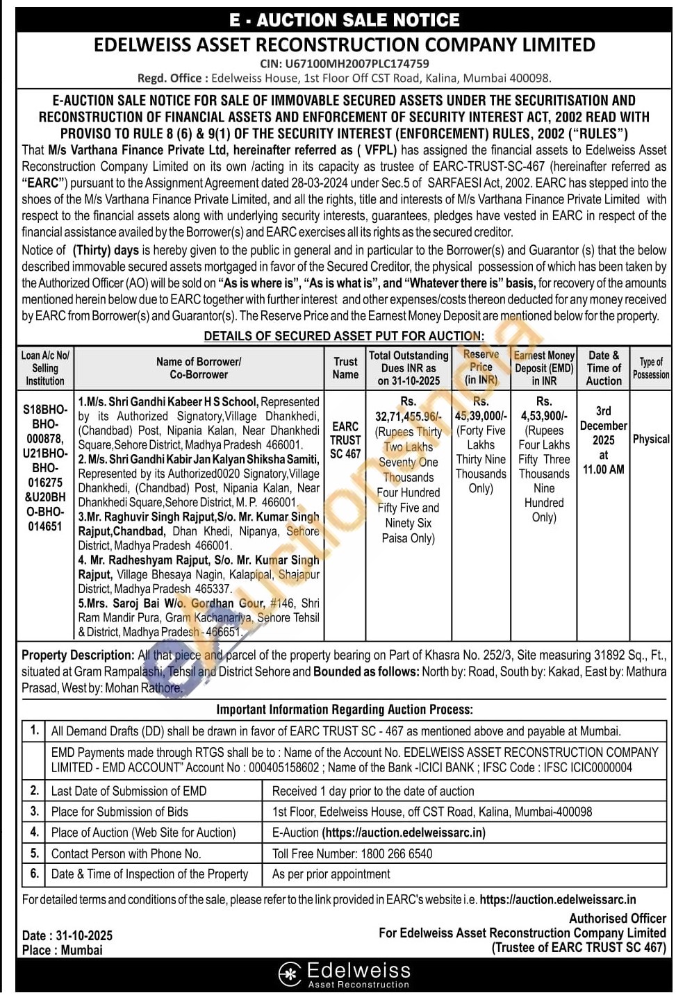 Property Description: All that piece and parcel of the property bearing on Part of Khasra No. 252/3, Site measuring 31892 Sq., Ft., situated at Gram Rampalashi, Tehsil and District Sehore and Bounded as follows: North by: Road, South by: Kakad, East by: Mathura Prasad, West by: Mohan Rathore