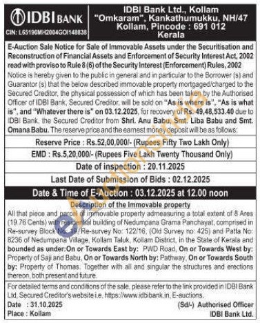 Description of the Immovable property : All that piece and parcel of immovable property admeasuring a total extent of 8 Ares (19.76 Cents) with residential building of Nedumpana Grama Panchayat, comprised in Re-survey Block No: 19, Re-survey No: 122/16, (Old Survey no 425) and Patta No 8236 of Nedumpara Village, Kollam Taluk, Kollam District, in the State of Kerala and bounded as under: On or Towards East by: PWD Road, On or Towards West by: Property of Saji and Babu, On or Towards North by: Pathway. On or Towards South by: Property of Thomas. Together with all and singular the structures and erections thereon, both present and future