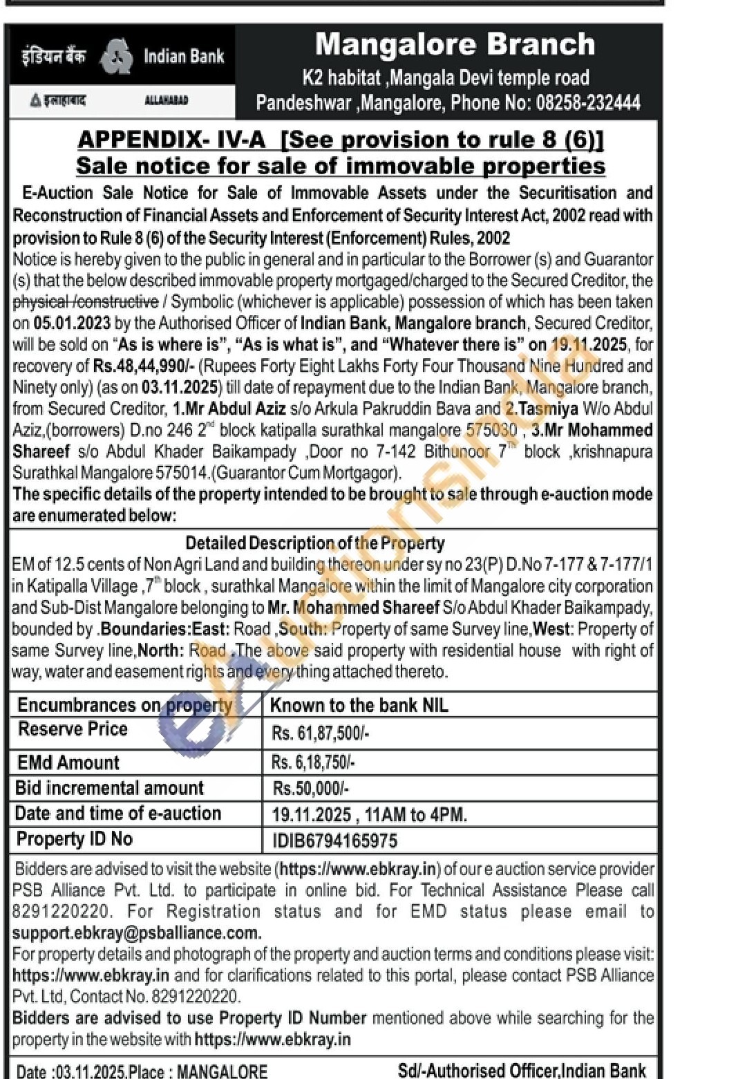 EM of 12.5 cents of Non Agri Land and building thereon under sy no 23(P) D.No 7-177 & 7-177/1 in Katipalla Village, 7" block, surathkal Mangalore within the limit of Mangalore city corporation and Sub-Dist Mangalore belonging to Mr. Mohammed Shareef S/o Abdul Khader Baikampady, bounded by Boundaries: East: Road, South: Property of same Survey line, West: Property of same Survey line, North: Road. The above said property with residential house with right of way, water and easement rights and every thing attached thereto.