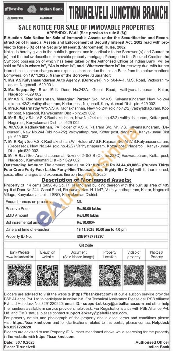 Description of Mortgaged Assets: Property :3 14 cents (6098.40 Sq. Ft) of land and building thereon with the built up area of 485 sq. ft at Door No.244, Gopal Road, Re-survey Nos. N-11/47, Vaithiyanathapuram, Kottar, Nagercoil Village, Kanyakumari Joint I SRO, Kanyakumari District
