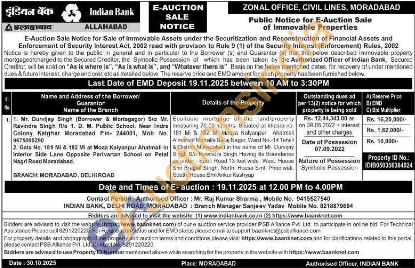 Equitable mortgage of the land/property measuring 70.00 sq mtrs. Situated at khasra no. 181 Mi & 182 Mi Mauza Kalyanpur Ahalmali Almaroof Mohalla Suraj Nagar, Ward No.-14 Tehsil & District Moradabad in the name of Mr. Durvijay Singh Sio Ravindra Singh Having its Boundaries as under-East: Road 13 feet wide, West: House Shri Brajpal Singh, North: House Smt. Phoolwati, South: House Shri Ankur Kashyap