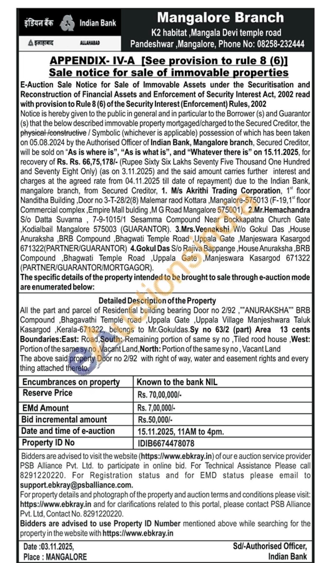 All the part and parcel of Residential building bearing Door no 2/92, "ANURAKSHA BRB Compound Bhagavathi Temple road Uppala Gate, Uppala Village Manjeshwara Taluk Kasargod, Kerala-671322, belongs to Mr.Gokuldas. Sy no 63/2 (part) Area 13 cents Boundaries:East: Road, South: Remaining portion of same sy no, Tiled rood house,West: Portion of the same sy no, Vacant Land, North: Portion of the same sy no, Vacant Land