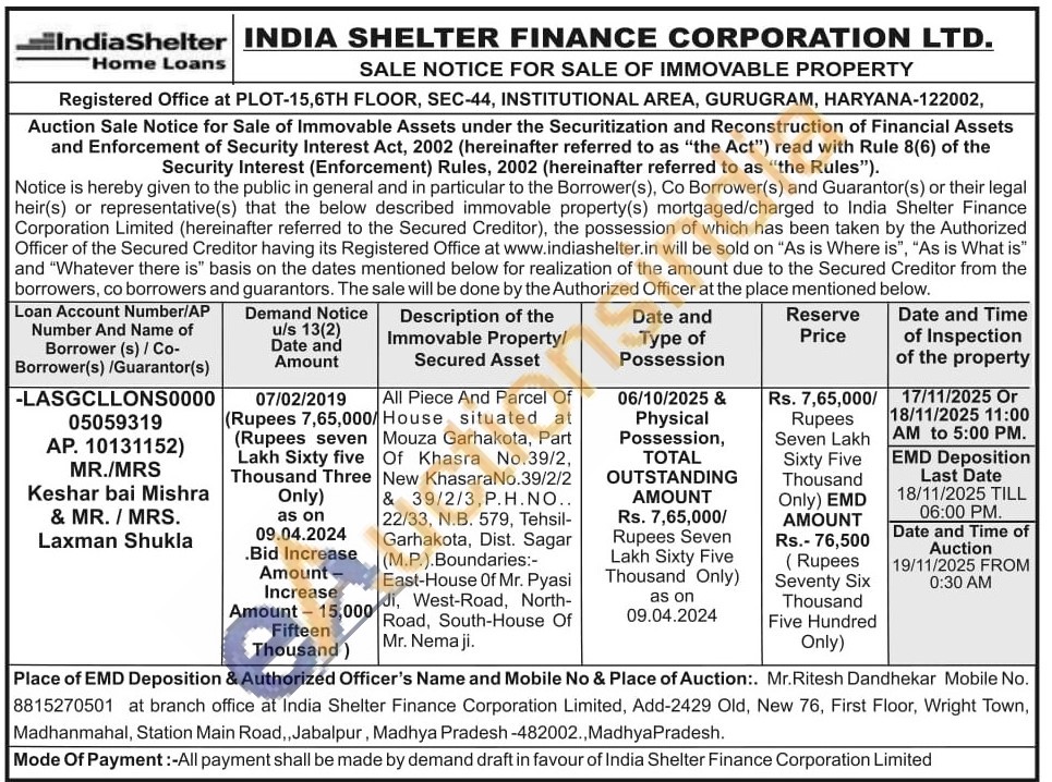 All Piece And Parcel Of House situated at Mouza Garhakota, Part Of Khasra No.39/2, New KhasaraNo.39/2/2 & 39/2/3,Ρ.Η.ΝΟ.. 22/33, Ν.Β. 579, Tehsil-Garhakota, Dist. Sagar (M.P.). Boundaries:-East-House Of Mr. Pyasi Ji, West-Road, North-Road, South-House Of Mr. Nema ji