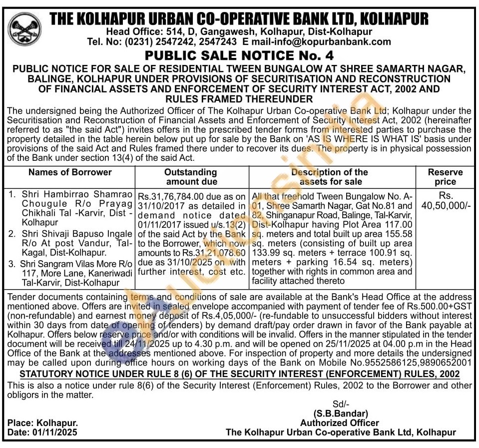 All that freehold Tween Bungalow No. A-01, Shree Samarth Nagar, Gat No.81 and 82, Shinganapur Road, Balinge, Tal-Karvir, Dist-Kolhapur having Plot Area 117.00 sq. meters and total built up area 155.58 sq. meters (consisting of built up area 133.99 sq. meters + terrace 100.91 sq. meters + parking 16.54 sq. meters) together with rights in common area and facility attached thereto