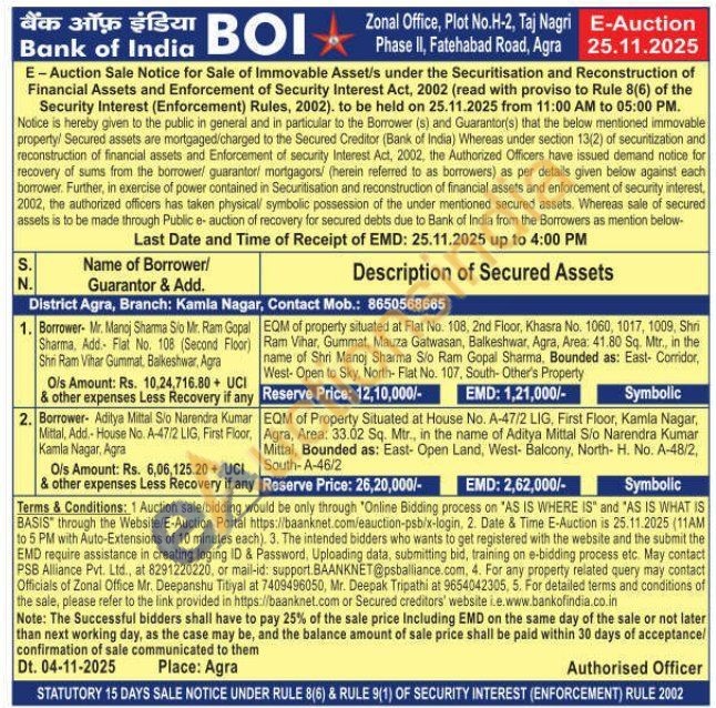 EQM of property situated at Flat No. 108, 2nd Floor, Khasra No. 1060, 1017, 1009, Shri Ram Vihar, Gummat, Mauza Gatwasan, Balkeshwar, Agra, Area: 41.80 Sq. Mtr., in the name of Shri Manoj Sharma Sio Ram Gopal Sharma, Bounded as: East- Corridor, West- Open to Sky, North- Flat No. 107, South- Other's Property