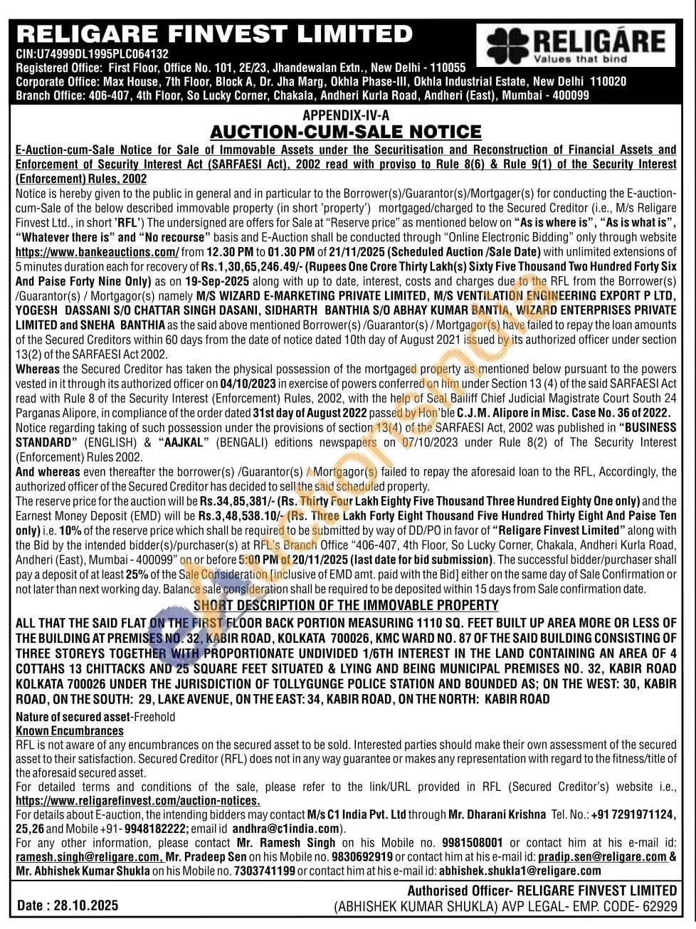 ALL THAT THE SAID FLAT ON THE FIRST FLOOR BACK PORTION MEASURING 1110 SQ. FEET BUILT UP AREA MORE OR LESS OF THE BUILDING AT PREMISES NO. 32, KABIR ROAD, KOLKATA 700026, KMC WARD NO. 87 OF THE SAID BUILDING CONSISTING OF THREE STOREYS TOGETHER WITH PROPORTIONATE UNDIVIDED 1/6TH INTEREST IN THE LAND CONTAINING AN AREA OF 4 COTTAHS 13 CHITTACKS AND 25 SQUARE FEET SITUATED & LYING AND BEING MUNICIPAL PREMISES NO. 32, KABIR ROAD KOLKATA 700026 UNDER THE JURISDICTION OF TOLLYGUNGE POLICE STATION AND BOUNDED AS; ON THE WEST: 30, KABIR ROAD, ON THE SOUTH: 29, LAKE AVENUE, ON THE EAST: 34, KABIR ROAD, ON THE NORTH: KABIR ROAD