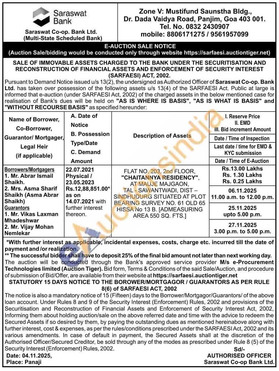 FLAT NO. 203, 2nd FLOOR, "CHAITANNYA RESIDENCY", AT MAUJE MAJGAON, TAL-SAWANTWADI, DIST -SINDHUDURG SITUATED AT PLOT BEARING SURVEY NO. 61 OLD 65 HISSA No 13 B. [ADMEASURING AREA 550 SQ. FTS.]
