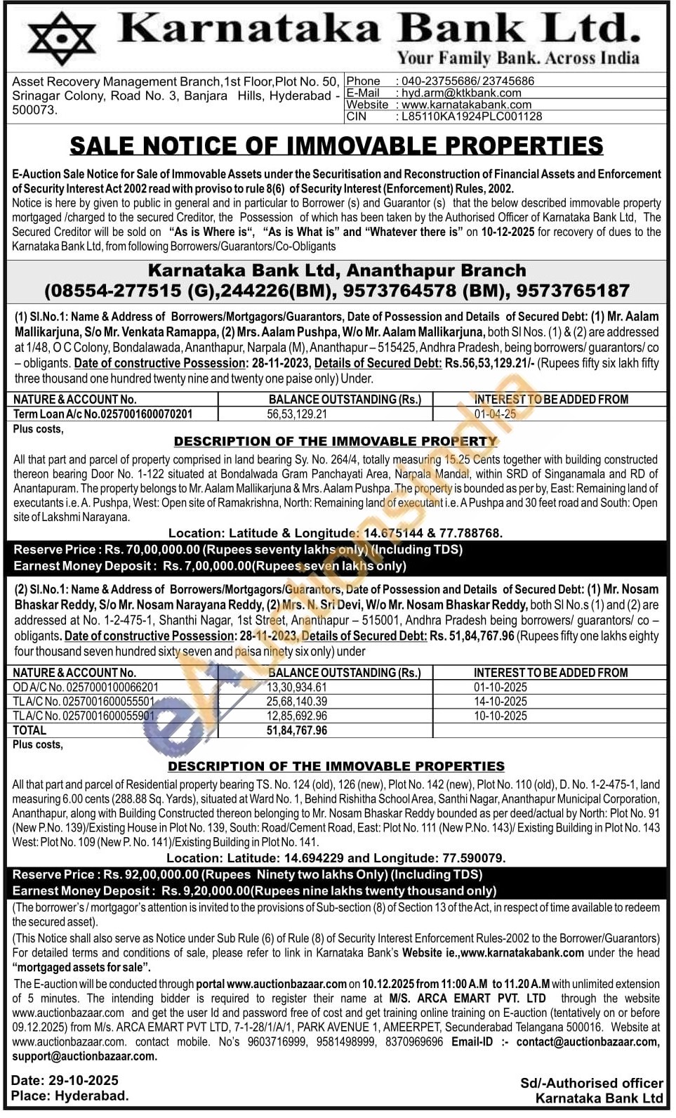 DESCRIPTION OF THE IMMOVABLE PROPERTIES : All that part and parcel of Residential property bearing TS. No. 124 (old), 126 (new), Plot No. 142 (new), Plot No. 110 (old), D. No. 1-2-475-1, land measuring 6.00 cents (288.88 Sq. Yards), situated at Ward No. 1, Behind Rishitha School Area, Santhi Nagar, Ananthapur Municipal Corporation, Ananthapur, along with Building Constructed therean belonging to Mr. Nosam Bhaskar Reddy bounded as per deed/actual by North: Plot No. 91 (New P.No. 139)/Existing House in Plot No. 139, South: Road/Cement Road, East: Plot No. 111 (New P.No. 143)/ Existing Building in Plot No. 143 West: Plot No. 109 (New P. No. 141)/Existing Building in Plot No. 141.