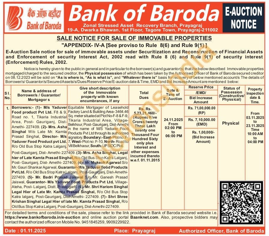 Equitable Mortgager of Leasehold Factory Land & Building Area-3464.46 Sq. meter situated at Plot No-F-8&F-9. Tikaria Industrial Area, Village-Belkhour, Post-Gauriganj, Dist-Amethi in the name of M/S Yaduver Food Products Pvt Ltd through its authorized signatory. Boundary:-East-Plot no: F-7, West-Plot no: F-10, North- Road to Vill Belkhaour, South-UP SIDC Plot.