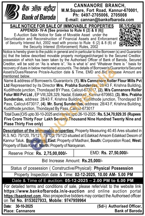 Description of the immovable properties: Property Measuring 40.45 Ares situated in R.S. NO. 75/120, 75/121, 75/122, 75/123 situated at Edakkad Amsom Edakkad Desom of Kannur Taluk. Boundaries: East: Property of Madhavi, South: Corporation Road, West: Property of Bala Kurup, North: Property of Narayanan