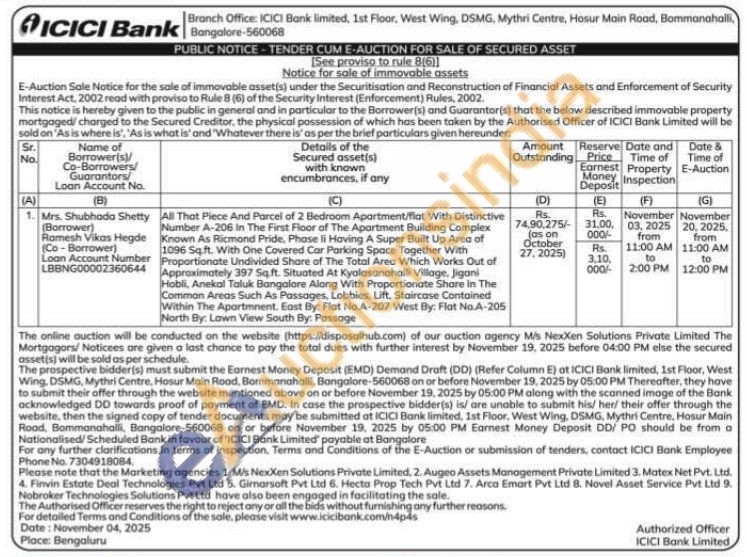 All That Piece And Parcel of 2 Bedroom Apartment/flat With Distinctive Number A-206 In The First Floor of The Apartment Building Complex Known As Ricmond Pride, Phase li Having A Super Built Up Area of 1096 Sq.ft. With One Covered Car Parking Space Together With Proportionate Undivided Share of The Total Area Which Works Out of Approximately 397 Sq.ft. Situated At Kyalasanahalli Village, Jigani Hobli, Anekal Taluk Bangalore Along With Proportionate Share in The Common Areas Such As Passages, Lobbies, Lift, Staircase Contained Within The Apartmnent. East By: Flat No.A-207 West By: Flat No.A-205 North By: Lawn View South By: Passage