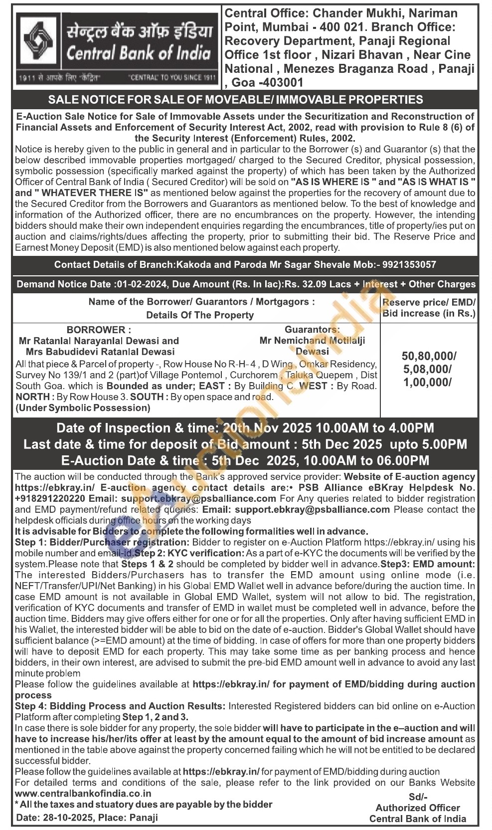 All that piece & Parcel of property, Row House No R-H-4, D Wing, Omkar Residency, Survey No 139/1 and 2 (part) of Village Pontemol, Curchorem, Taluka Quepem, Dist South Goa. which is Bounded as under; EAST: By Building C. WEST: By Road. NORTH: By Row House 3. SOUTH: By open space and road