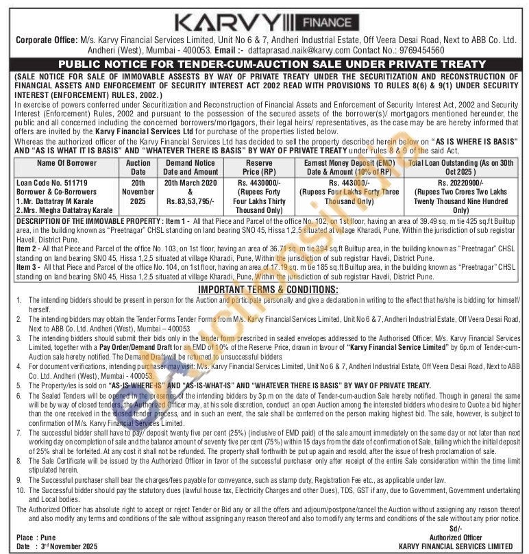 DESCRIPTION OF THE IMMOVABLE PROPERTY: Item 1 All that Piece and Parcel of the office No. 102, on 1st floor, having an area of 39.49 sq. m tie 425 sq.ft Builtup area, in the building known as "Preetnagar" CHSL standing on land bearing SNO 45, Hissa 1,2,5 situated at village Kharadi, Pune, Within the jurisdiction of sub registrar Haveli, District Pune. Item 2-All that Piece and Parcel of the office No. 103, on 1st floor, having an area of 36.71 sq. m tie 394 sq.ft Builtup area, in the building known as "Preetnagar" CHSL standing on land bearing SNO 45, Hissa 1,2,5 situated at village Kharadi, Pune, Within the jurisdiction of sub registrar Haveli, District Pune. Item 3 All that Piece and Parcel of the office No. 104, on 1st floor, having an area of 17.19 sq. m tie 185 sq.ft Builtup area, in the building known as "Preetragar" CHSL standing on land bearing SNO 45, Hissa 1,2,5 situated at village Kharadi, Pune, Within the jurisdiction of sub registrar Haveli, District Pune